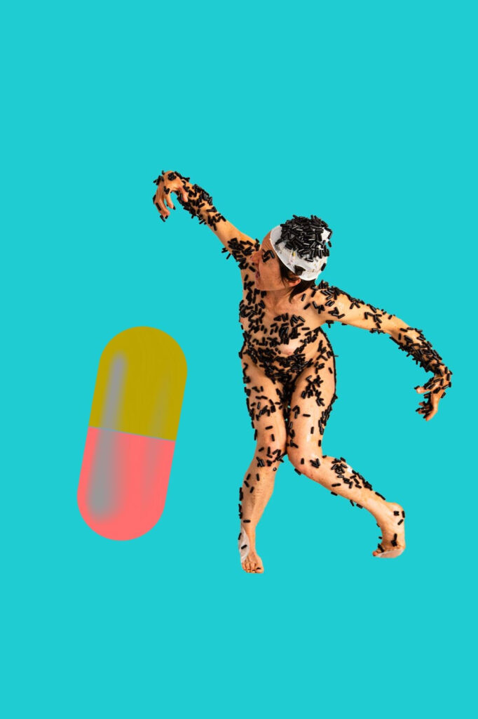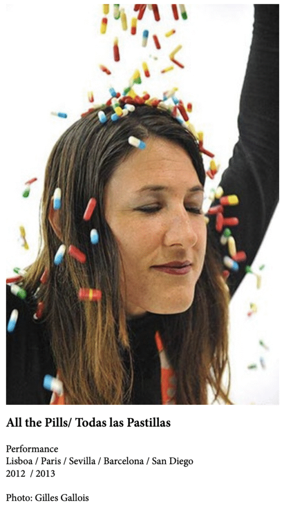 Jessica Hirst: Muy buen punto. En el futuro me gustaría volver a performance más inmersivos. Por ejemplo, hace años hice uno donde estimé cuántas pastillas había tomado por años y llené una cubeta e invité al público a meter las manos para sentir la textura de miles de cápsulas. También empecé a cubrir mi cuerpo con pastillas por lo multisensorial.