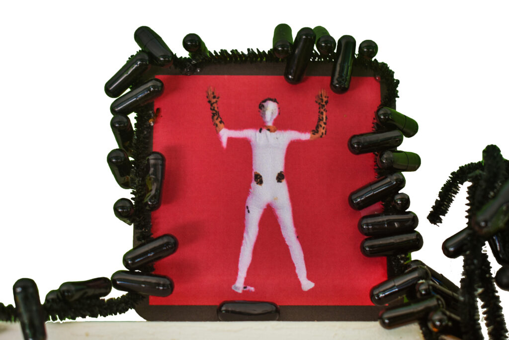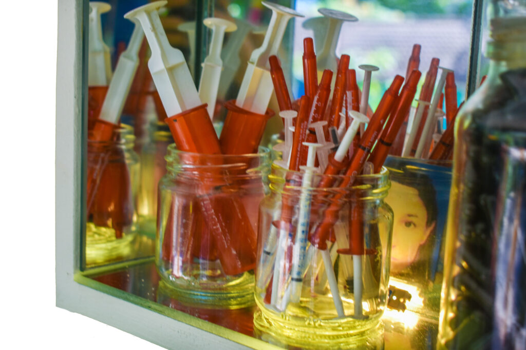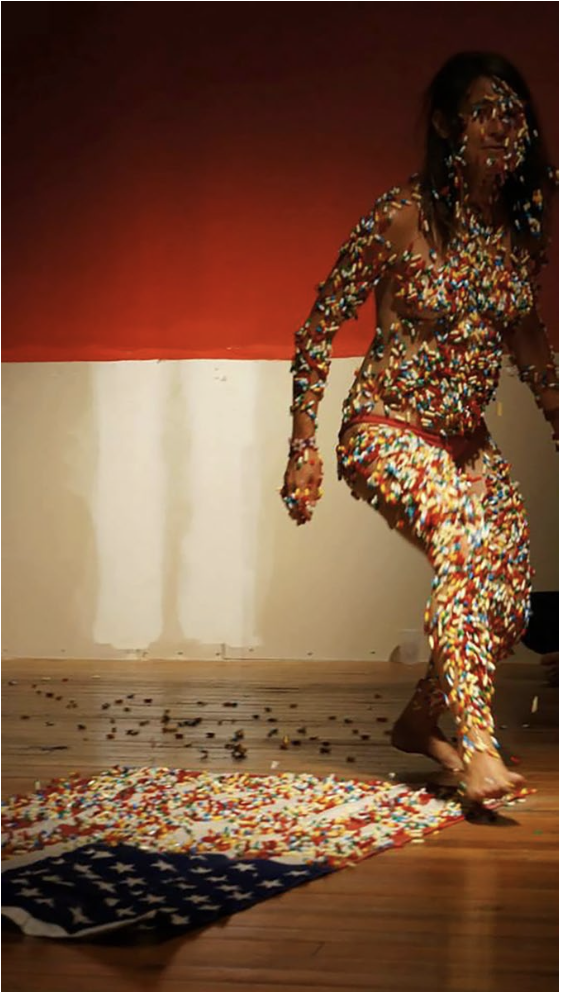 En un performance dos hombres representaban a psiquiatras y me cubrían con cápsulas vacías de colóres, pegadas con miel. Luego llamaban al público: “Vengan a tomar su medicina” como hacen a los pacientes en el hospital psiquiátrico . Ponían a la gente en fila y las personas tomaban una cápsula vacía desde mi cuerpo y tenía que ingerirla. En esta obra del botiquín de abstinencia hay foto, objeto, y video-performance, pero no es tan inmersivo como otras cosas que he hecho o me gustaría hacer.