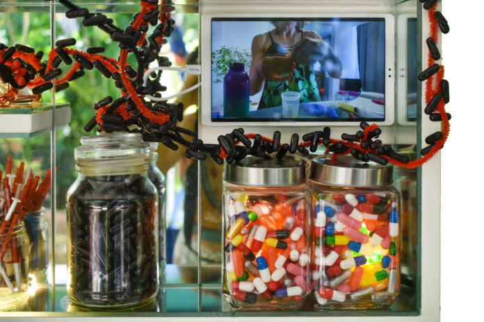Jessica Hirst: Muy buen punto. En el futuro me gustaría volver a performance más inmersivos. Por ejemplo, hace años hice uno donde estimé cuántas pastillas había tomado por años y llené una cubeta e invité al público a meter las manos para sentir la textura de miles de cápsulas. También empecé a cubrir mi cuerpo con pastillas por lo multisensorial.